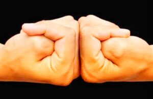 Curl in the thumb first by placing it on the root pad of little pinky fingers , and then keep the other four fingers on the palms, covering the thumbs.
